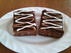 Eu am pus mai intai un rand de glazura de ciocolata (plic de la dr oetker), apoi am topit in cuptorul cu microunde separat si ciocolata neagra si ciocolata alba, le-am pus intr-o punguta am gaurit varful si am ornat.