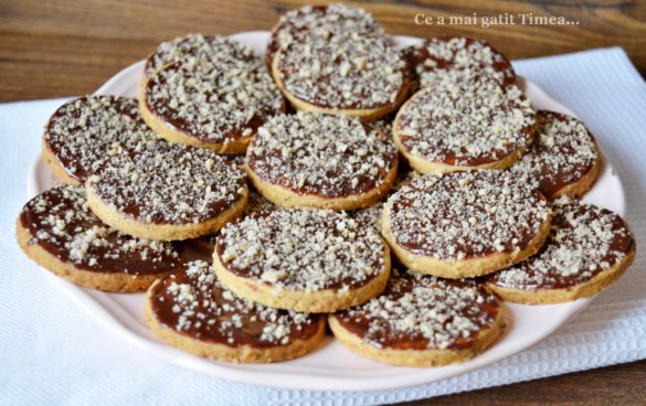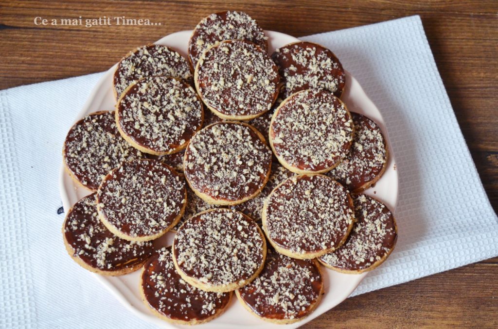 - Biscuitii raciti complet ii ungem cu glazura peste care presaram alune macinate.