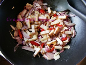 Intre timp taiem felii ceapa, ardeiul si slanina si punem la calit in uleiul de masline.