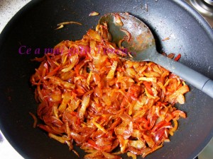 Lasam pe foc cateva minute pana capata ceapa o culoare aurie, adaugam apoi paprika sarea si piperul si luam de pe foc.