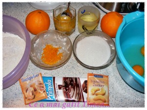 Avem nevoie de 2 boluri. In primul amestecam faina cu praful de copt si vanilie. In celalalt batem bine ouale pana isi dubleaza volumul si devin albe. Adaugam zaharul mixand in continuare, apoi adaugam pe rand uleiul, sucul de portocala si portocala rasa.