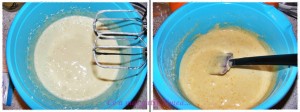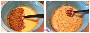 Incorporam apoi faina folosind o spatula. La final adaugam ciocolata rasa pe razatoarea mare.