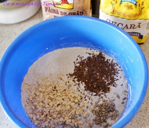 Intr-un bol amestecam faina cu sarea, semintele de floarea soarelui si in si fulgii de ovaz.