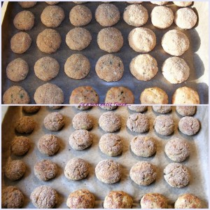 Asezam chiftelele in tava tapetata cu foaie de copt si dam la cuptorul preincalzit la 180 de grade timp de 50 de minute sau pana se rumenesc deasupra. Nu trebuie sa le intoarceti de pe o parte pe alta. Ca sa fiti siguri ca sunt facute, luati una si gustati.