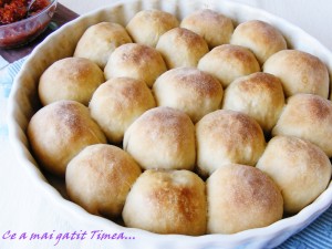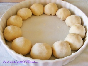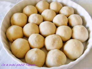 Asezam bilele formate, cu partea stransa in jos, intr-o tava termorezistenta unsa cu unt si tapetata cu faina si le lasam la dospit aprox 20 de minute.