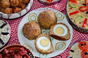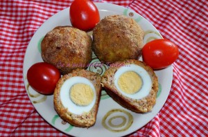Sunt convinsa ca multi dintre voi ati auzit de ouale aceastea scotiene. Eu le-am vazut de mult timp pe multe bloguri (http://www.divainbucatarie.ro/ , http://www.teoskitchen.ro/ etc. ) si la Paprika TV unde le prezenta Jammie Oliver. Am retinut ideea: adica carne tocata in care vine un ou fiert. Eu am folosit reteta mea de chiftele pentru invelis voi puteti folosi doar carne tocata cu condimentele dorite de voi.