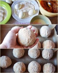 Ouale le dam prin faina si le invelim cu amestecul de carne tocata. Puteti imparti de la inceput carnea in 7 parti egale. Eu am intins in palma carnea, am aasezat oul in palma peste carne si am acoperit apoi oul.