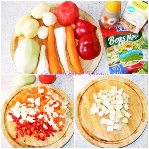 Cand legumele sunt semifierte adaugam rosia decojita si taiata marunt si cartofii taiati cubulete.