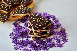 Ungem formele cu glazura de ciocolata folosind un cutit apoi ornam cu bombonele colorate.