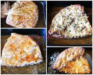 Intr-un bol amestecam ingredientele pt sos si cu jumatate din cantitate ungem prima parte a coastelor si presaram seminte de susan.  Dam la cuptor 15 minute, apoi scoatem din cuptor, intoarcem carnea de pe o parte pe alta si ungem si cealalta parte cu sosul dulce peste care presaram seminte de susan. Si dam iar 15 minute la cuptor.