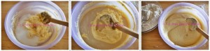 Amestecam intr-un bol margarina cu untura, zaharul, zaharul vanilat si sarea. Adaugam drojdia dospita si restul de apa.
