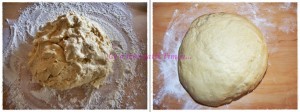 Apoi treptat incorporam faina pana obtinem un aluat pe care il intindem apoi pe masa de lucru si framantam pana nu se mai lipeste de degete.