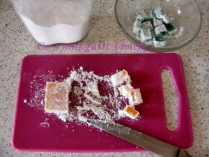 In acest timp taiem rahatul in bucatele mici. Pentru a nu se lipi cand taiem dam rahatul prin zahar pudra.