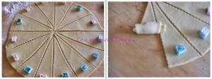 Intindem apoi o foaie rotunda pe care o taiem in triunghiuri. Asezam rahatul in capatul lat si rulam.