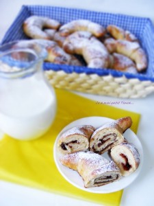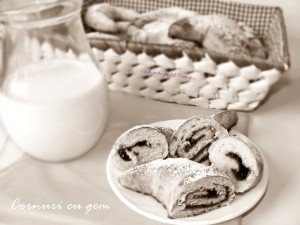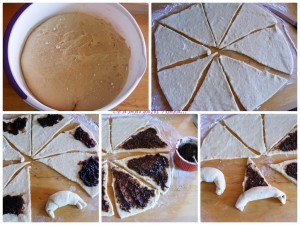 Aluatul dospit il impartim in doua. Luam prima bucata de aluat si o intindem sub forma rotunda, cu sucitorul, pe masa de lucru tapetata cu faina apoi cu un cutit taiem triunghiuri. Ungem cu gem si rulam. (vezi poza)