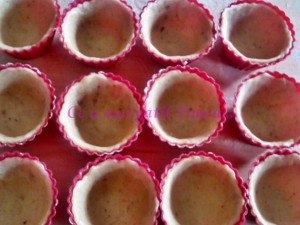 Scoatem aluatul din frigider si il impartim in 2. Din prima bucata intindem o foaie potrivit de subtire si cu o cana mai mare decupam cercuri pe care le asezam in formele de briose.
