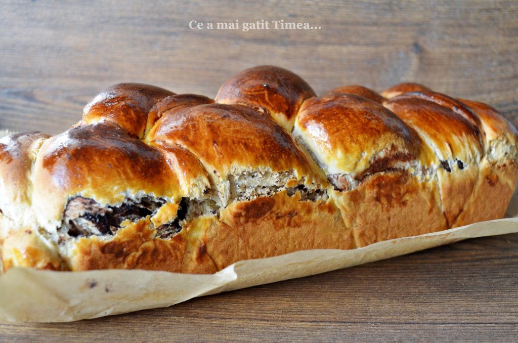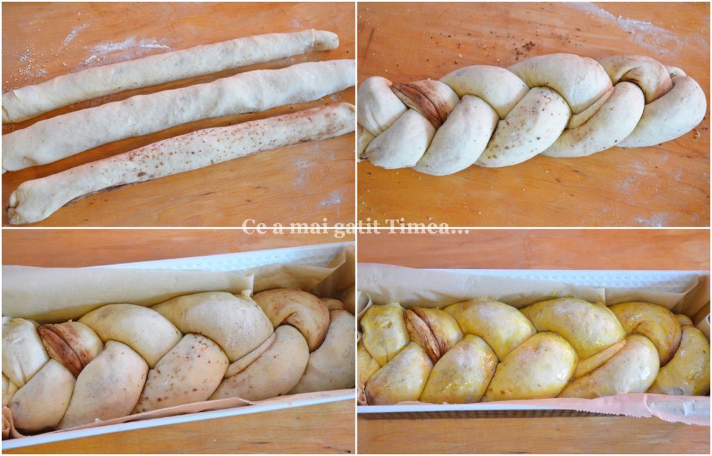 - Impletim cele trei suluri de aluat umplut si asezam impletitura in forma de cozonac tepatata cu hartie de copt sau unsa cu unt.