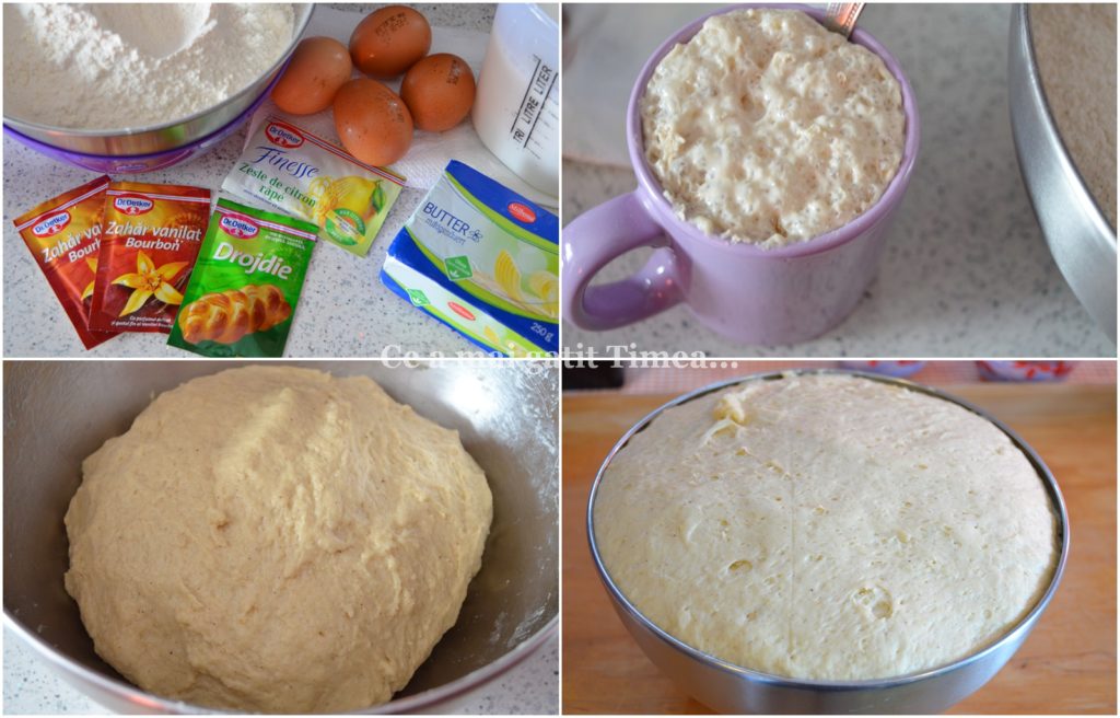 - Cernem faina intr-un bol, adaugam sarea, coaja de lamaie, zaharul vanilat si scortisoara, apoi turnam drojdia dospita. Adaugam ouale si galbenusurile si framantam cu mana adaugand treptat laptele caldut amestecat cu zaharul si spre final untul topit. Terminam de framantat cand nu se mai lipeste aluatul de maini.