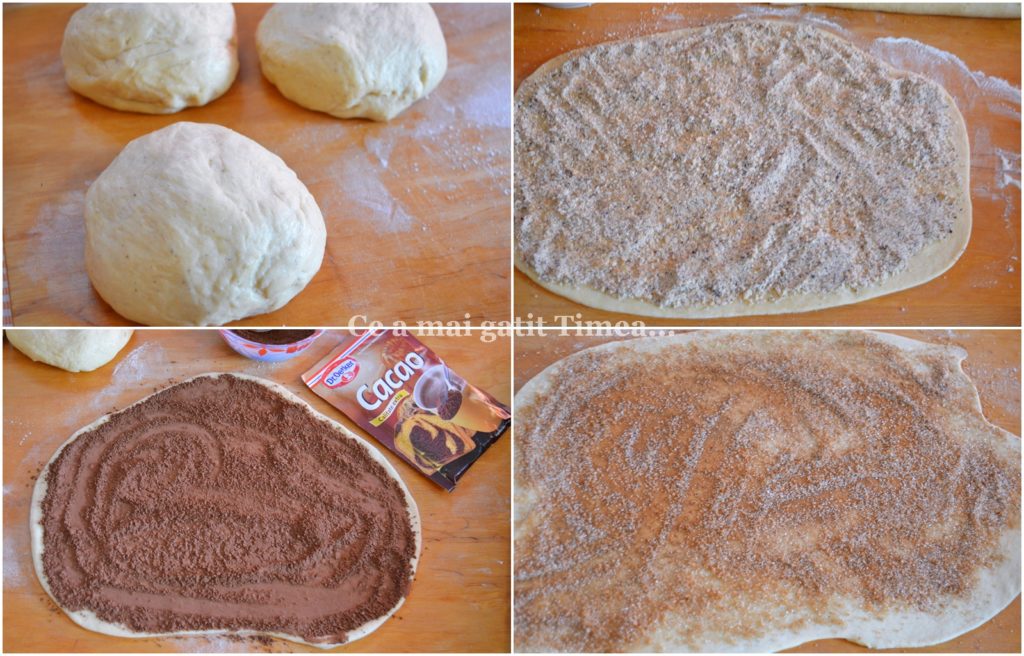 - Intindem pe rand cate o bila de aluat si presaram pe rand, pe una alunele, pe a doua cacaoa si pe a treia scortisoara si rulam.