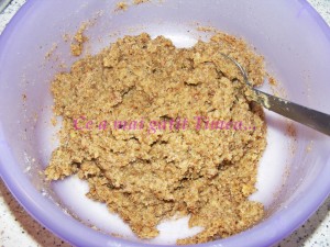 In acest timp pregatim umplutura. Batem spuma albusul de ou, adaugam zaharul mixand inca 2-3 minute. Adaugam apoi treptat nuca macinata, esenta de rom si laptele.