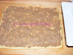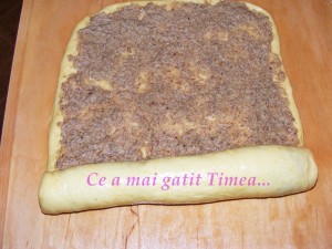 Intindem doua foi (se intinde foarte usor cu mana cu putin ulei), ungem cu umplutura de nuci si rulam.