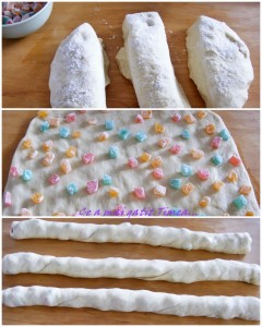 In acest timp pregatim umplutura. Rahatul in culori diverse il taiem bucatele pe un carpator presarat cu zahar pudra. Dam si rahatul si cutitul prin zahar pudra pentru a putea taia mai usor.