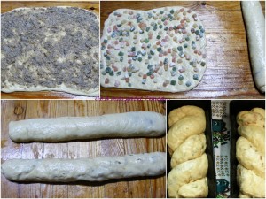 Aluatul dospit il impartim in 4. Intindem apoi pe rand cate o bucata pe masa de lucru unsa cu putin ulei si cu mainile la fel unse cu ulei. Putem folosi si sucitorul dar e mult mai simplu cu mainile. Doua din foi le ungem cu nuca si le rulam iar pe celelalte doua foi intinse asezam rahatul taiat bucatele si la fel le rulam.