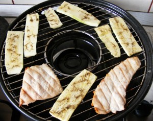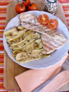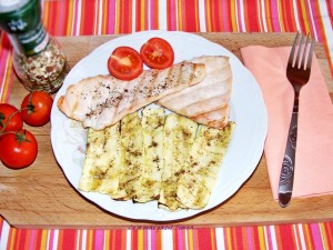 Punem feliile de piept de pui si dovlecel pe gratar si lasam cateva minute pe ambele parti.