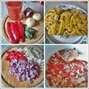 Se pune la calit ceapa si ardeiul tocat, timp de cateva minute, se adauga 2 cani de apa, iar cand apa fierbe se pune fasolea asa congelata cum e din congelator.