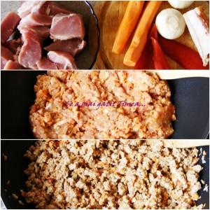 Curatam si spalam legumele si le taiem bucati mai mici. Carnea o spalam si o taiem cubulete. Dam carnea impreuna cu slanina si legumele prin masina de tocat carne.