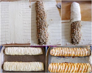 Aluatul il taiem in doua. Pe masa de lucru tapetata cu faina intindem pe rand fiecare foaie. Foaia vine impartita practic in trei, iar lateralele le taiem fasii de aprox 2 cm (vezi poza).