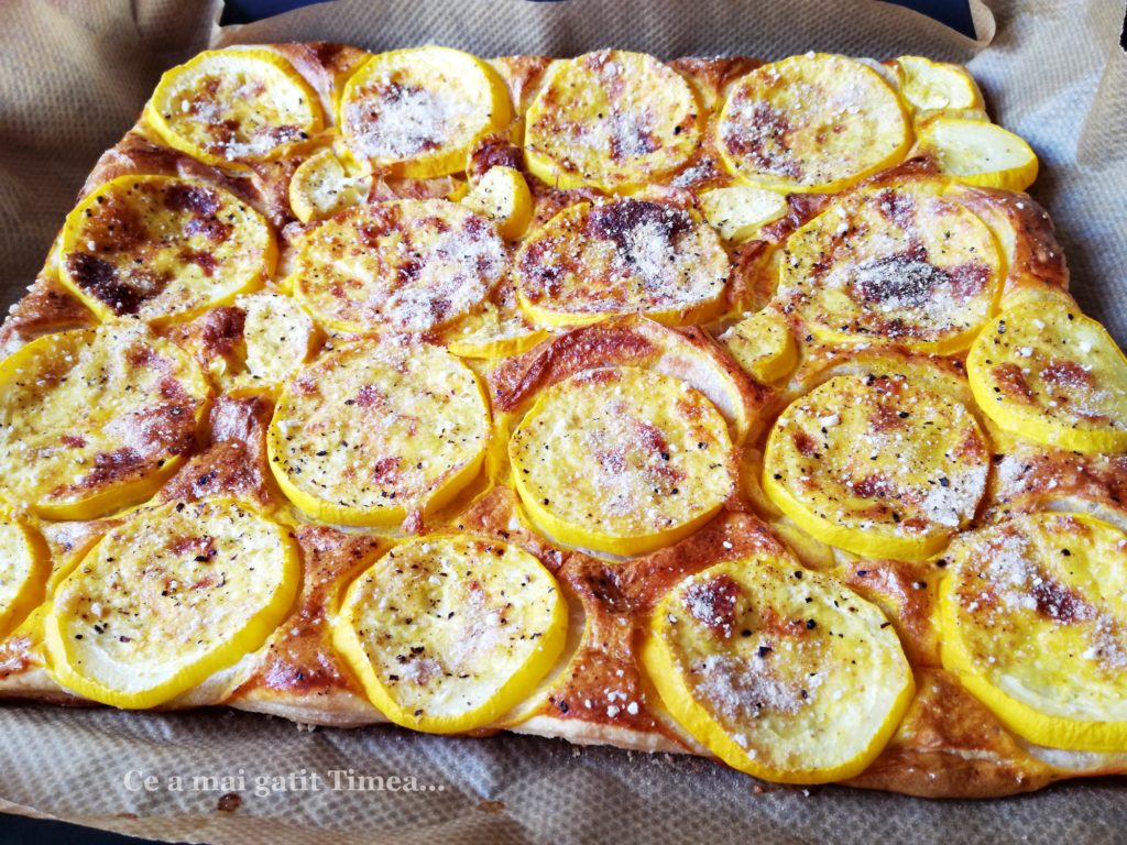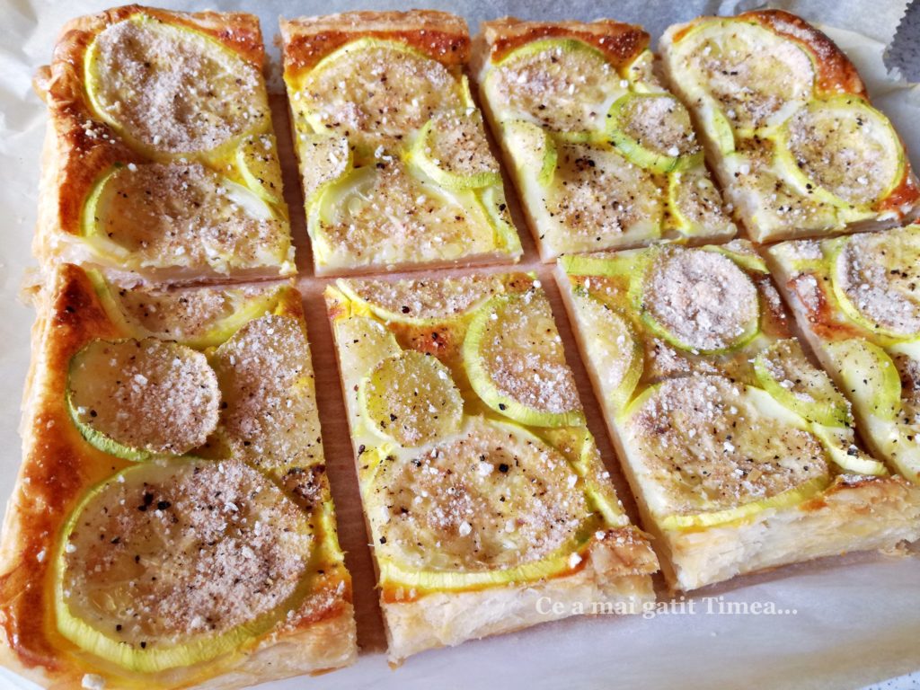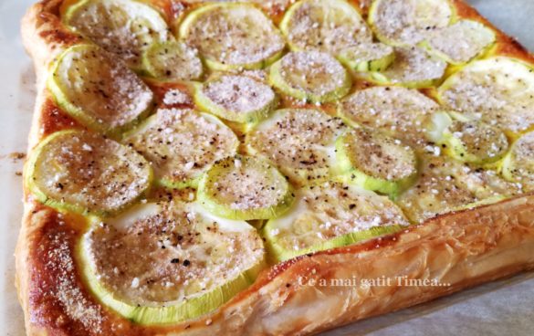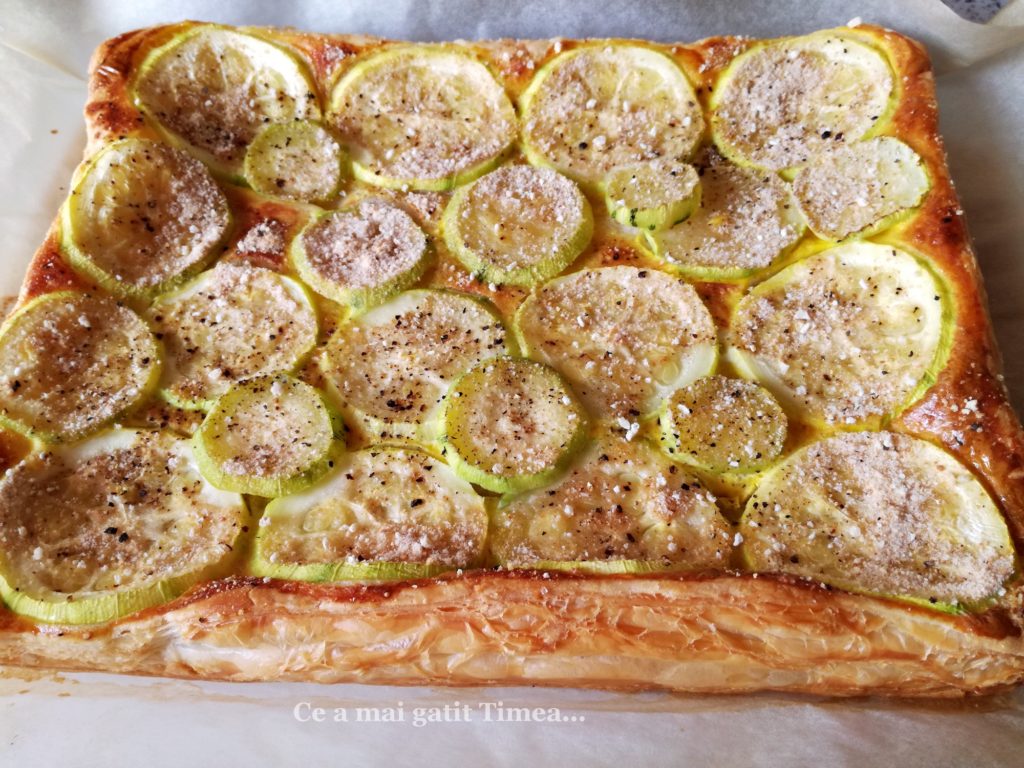 - Dovlecelul spalat il taiem felii si asezam feliile peste foietaj. Stropim feliile cu restul de ou batut si presaram deasupra putin pesmet, apoi presaram sarea si piperul.