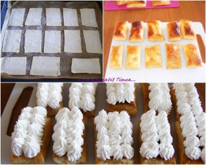Pe blatul de lucru tapetat cu faina intindem aluatul cu sucitorul. Cu un cutit cu lama ascutita taiem foaia in dreptunghiuri pe care le asezam intr-o tava tapetata cu hartie de copt. Presaram deasupra zahar pudra si dam la cuptorul preincalzit la 200 de grade timp de aprox 10 minute.