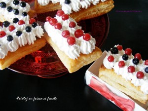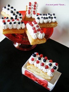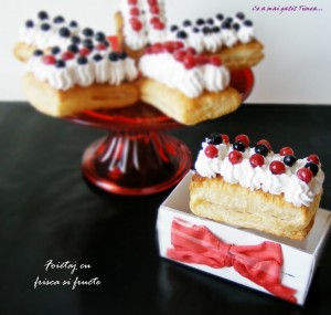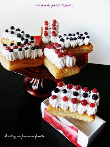 Un desert delicios facut din doar cateva ingrediente intr-un timp destul de scurt. Cand nu aveti chef sa cocariti prea mult sau sa lucrati prea mult pentru un desert, aceasta combinatie de foietaj, frisca si fructe, este perfecta.