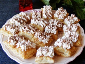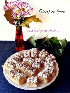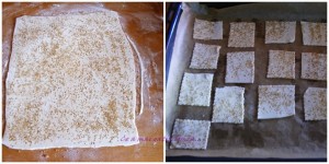 Am taiat apoi aluatul in patratele pe care le-am asezat intr-o tava tapetata cu hartie de copt si am bagat tava a cuptorul preincalzit la 175 de grade timp de 10-15 minute, pana s-au rumenit deasupra.
