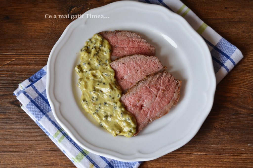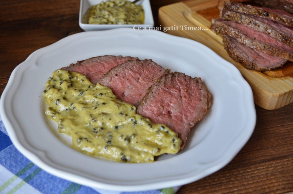 - Transferam carnea intr-o tava (eu am folosit o tava de sticla termorezistenta), turnand peste si sosul lasat de carne in urma prajirii. (tigaia o punem deoparte dar nu o spalam pentru ca o folosim exact asa cu urme de ulei aromat, pentru sosul de piper). Punem bucatile de unt peste carnea fierbinte si dam tava la cuptorul preincalzit la 180 de grade timp de aprox 18-20 de minute. Pentru medium rare carnea trebuie sa ajunga la o temperatura de 55-60 grade C si pentru a avea temperatura optima, folosim un termomentru pentru carne.