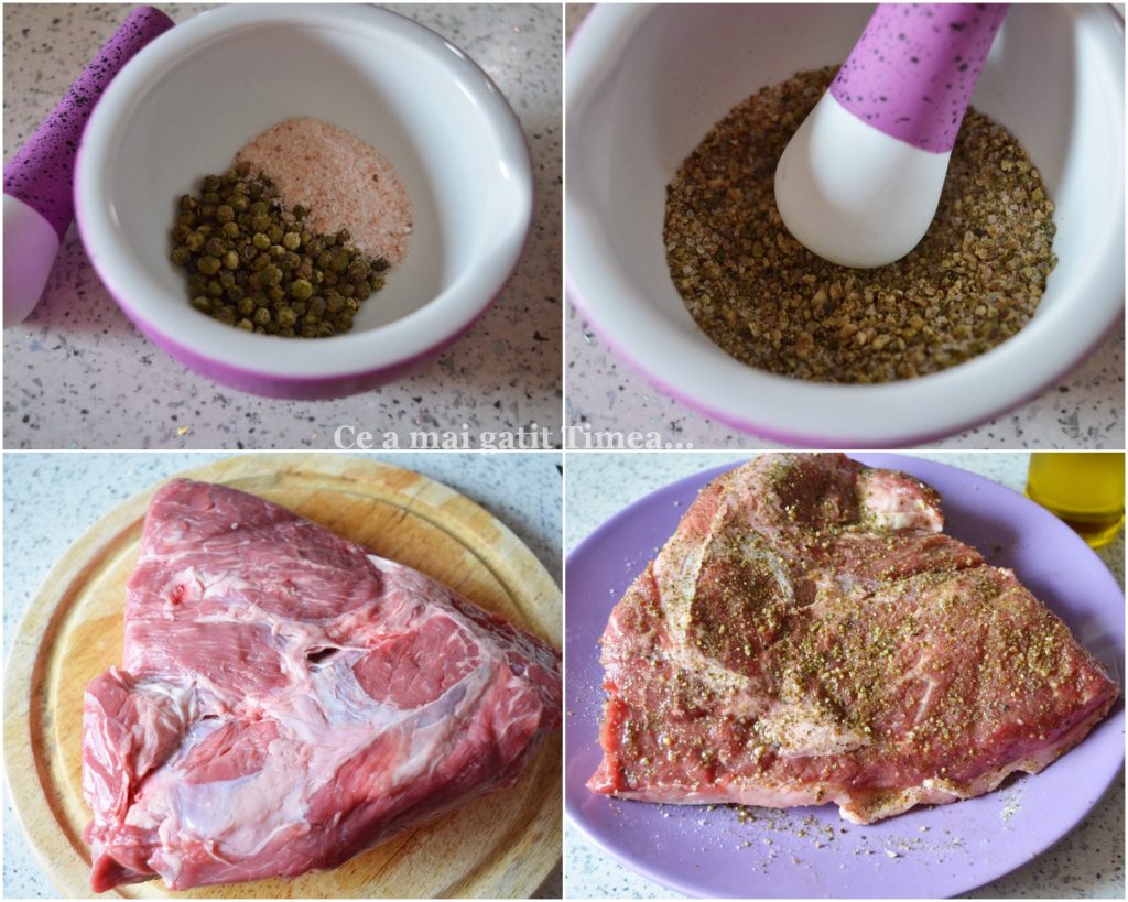 - Carnea la temperatura camerei o ungem cu putin ulei de masline si condimentem cu amestecul de sare si piper.