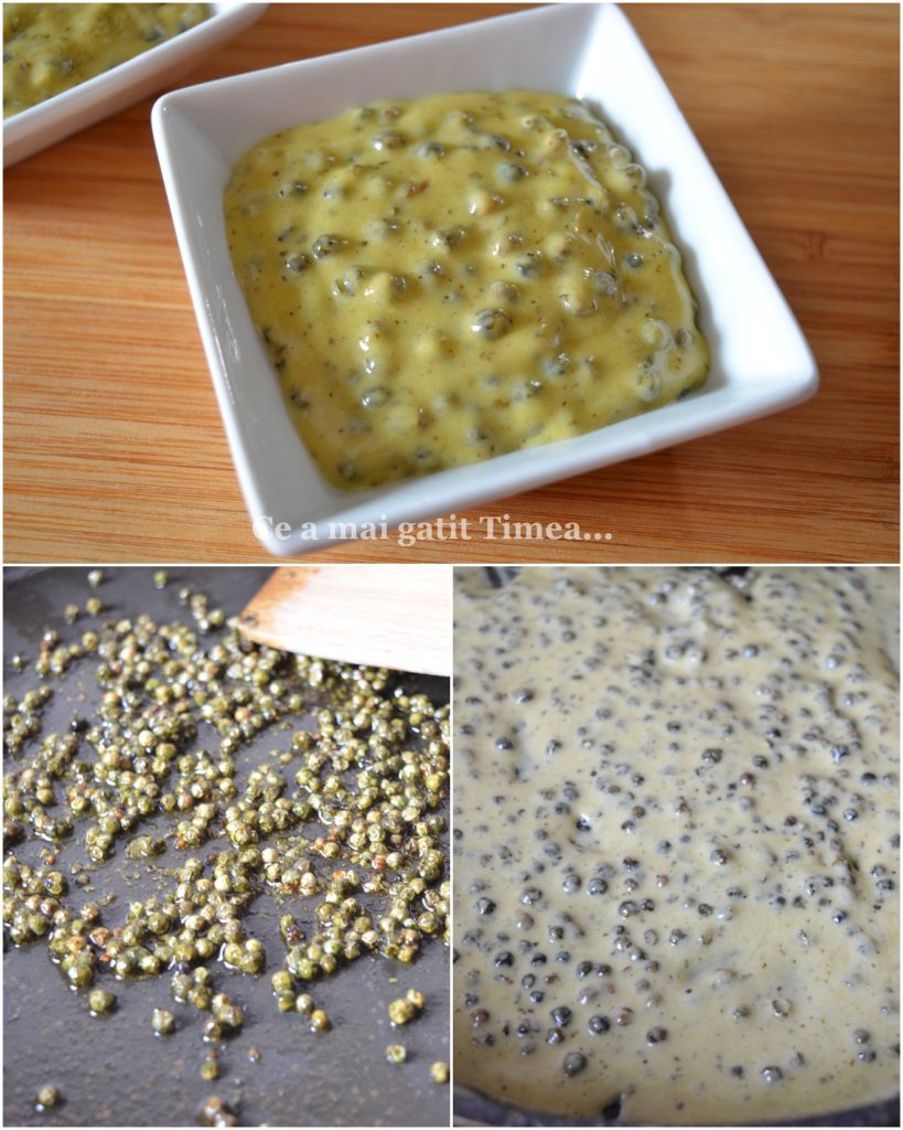 - Picuram in tigaia in care am prajit carnea un pic de ulei si prajim usor boabele e piper verde. Adaugam o lingura de coniac si lasam sa se evapore alcoolul apoi adaugam smantana pentru frisca si lasam la foc mic pana se ingroasa usor. Adaugam sare dupa gust.
