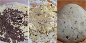 Intr-un bol amestecam untura cu sarea, zaharul si oul batut. Adaugam fulgii de ciocolata si esenta, apoi treptat incorporam faina. Spre final punem aluatul pe masa tapetata cu faina si framantam pana incorporam restul de faina si nu se mai lipeste de degete.