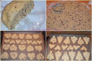 Scoatem aluatul din frigider si il taiem in doua. Pe rand intindem fiecare foaie pe masa tapetata cu faina si decupam formele dorite. Aluatul ramas la fel il intindem si decupam fome de aprox 5 mm grosime.