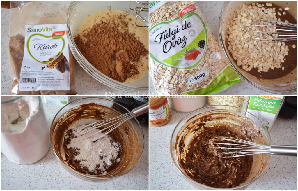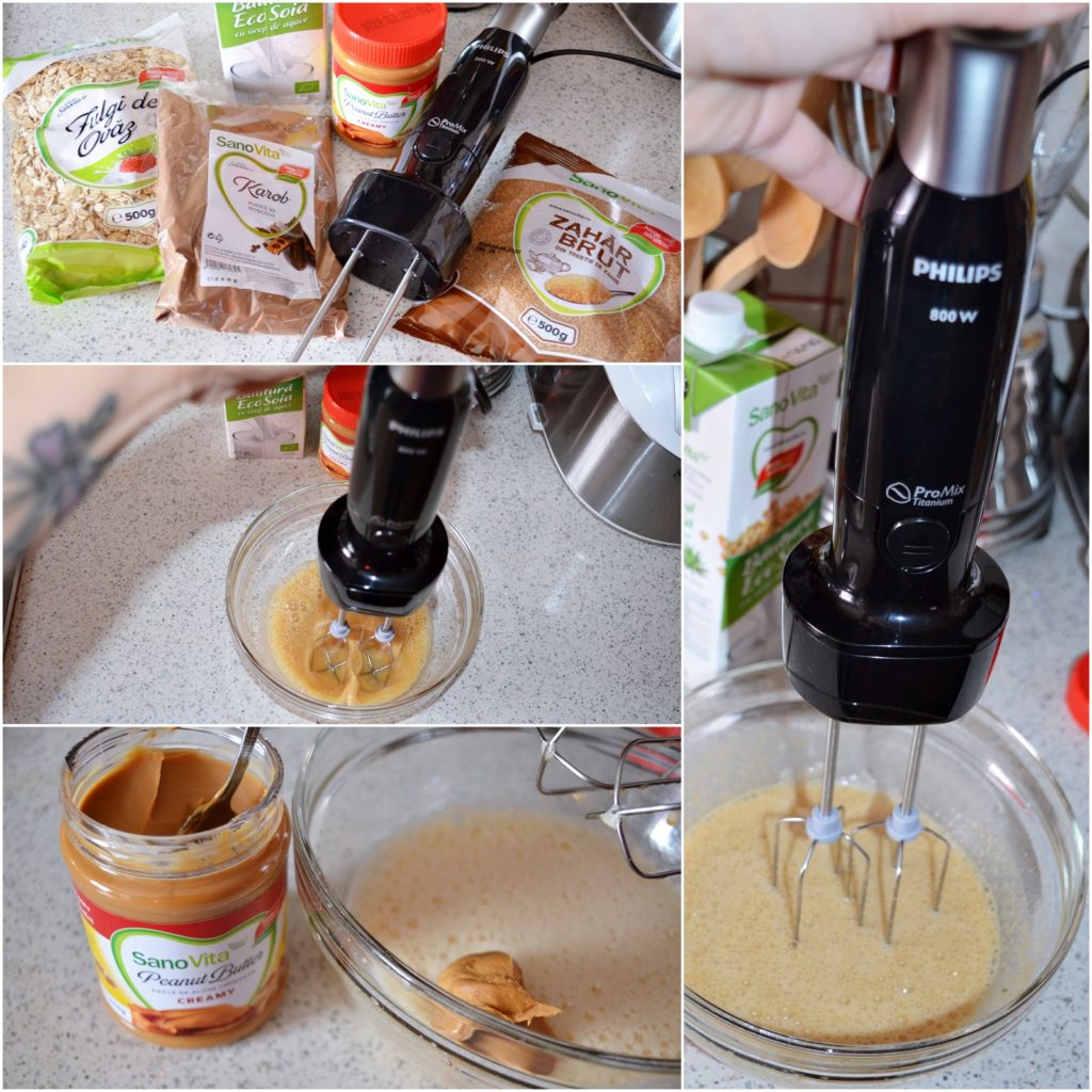 - Mixam ouale intregi cu praful de sare si zaharul brut adaugand apoi si untul de arahide si laptele de soia. Eu am folosit pentru mixare, mixerul vertical de la Philips