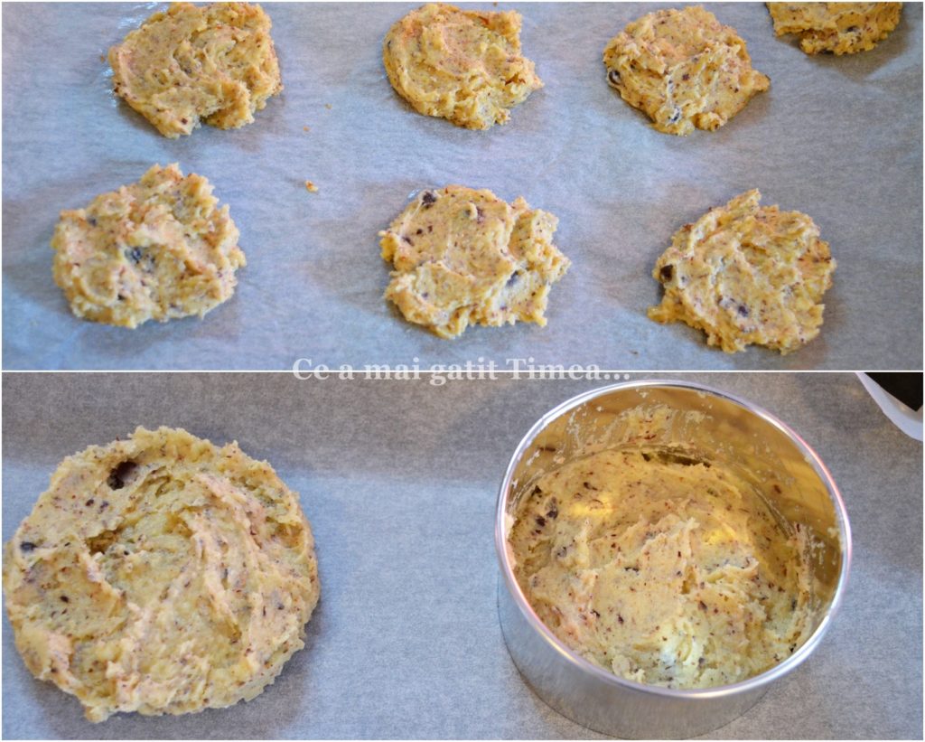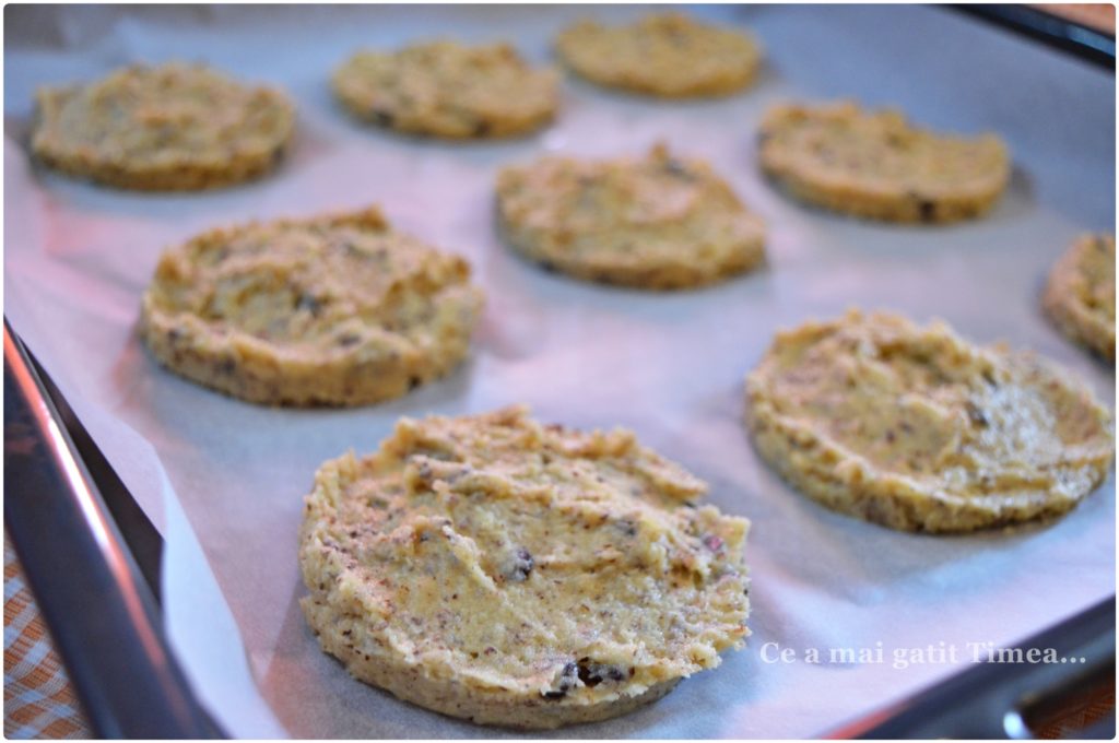 - Scoatem vasul din frigider si cu ajutorul a doua linguri luam din compozitie si punem direct in tava tapetata cu hartie de copt, fie folosim o forma de gogosi in care punem compozitia pentru a avea fursecuri mai rotunde.