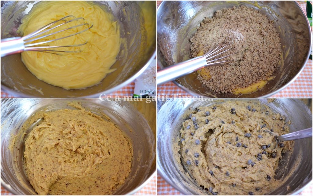 - Mixam intr-un bol ouale cu un varf de sare, indulcitorul si zaharul vanilat apoi rand pe rand adaugam untul si restul ingredientelor si amestecam cu un tel.