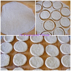Intindem aluatul si decupam cu o forma rotunda. Punem cercurile pe o plansa si le lasam la dospit inca 20 de minute.