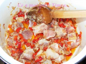 Tocam marunt ceapa si ardeiul si calim 2-3 minute adaugand si rosia decojita. Adaugam carnea spalata si taiata cubulute. Lasam si carnea la calit aprox 4-5 minute apoi turnam peste carne 4 cani de apa fierbinte.