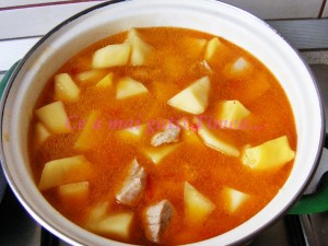 Cand carnea este fiarta, mai completam cu apa fierbinte si adaugam cartofii spalati, curatati si taiati cubulete.