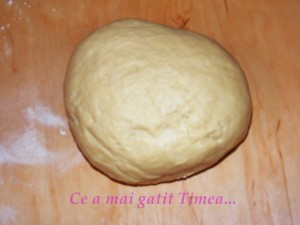 Intr-un bol amestecam margarina si untura, adaugam oul batut, sarea si drojdia dospita. Incorporam apoi treptat faina pana nu mai putem sa amestecam cu lingura apoi o turnam pe plansa de lucru si framantam adaugand faina pana nu se mai lipeste de degete.
