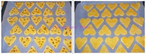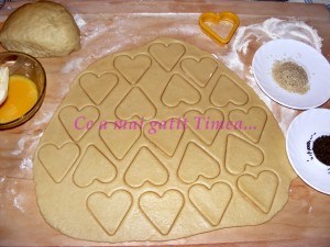 Lasam sa respire vreo 10-15 min, apoi impartim aluatul in doua si pe rand intindem foi de aprox 3 mm si decupam inimioarele.