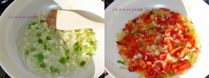 Curatam si spalam bine legumele. Tocam ceapa marunt si o punem la calit in uleiul de masline 2-3 minute. Adaugam apoi ardeiul taiat felii si lasam in continuare sa se caleasca impreuna cu ceapa.