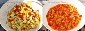 Rosiile le decojim, le taiem cubulete si le adaugam peste restul de legume. Lasam sa fiarba pana scade apa de la rosii. Adaugam sare si piper dupa gust si busuiocul tocat marunt.